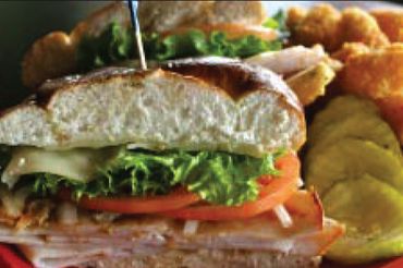 Grilled turley & Swiss cheese topped with lettuce, tomato & onion on our special twisted pretzel bun,served with Italian dressing on side & chips
